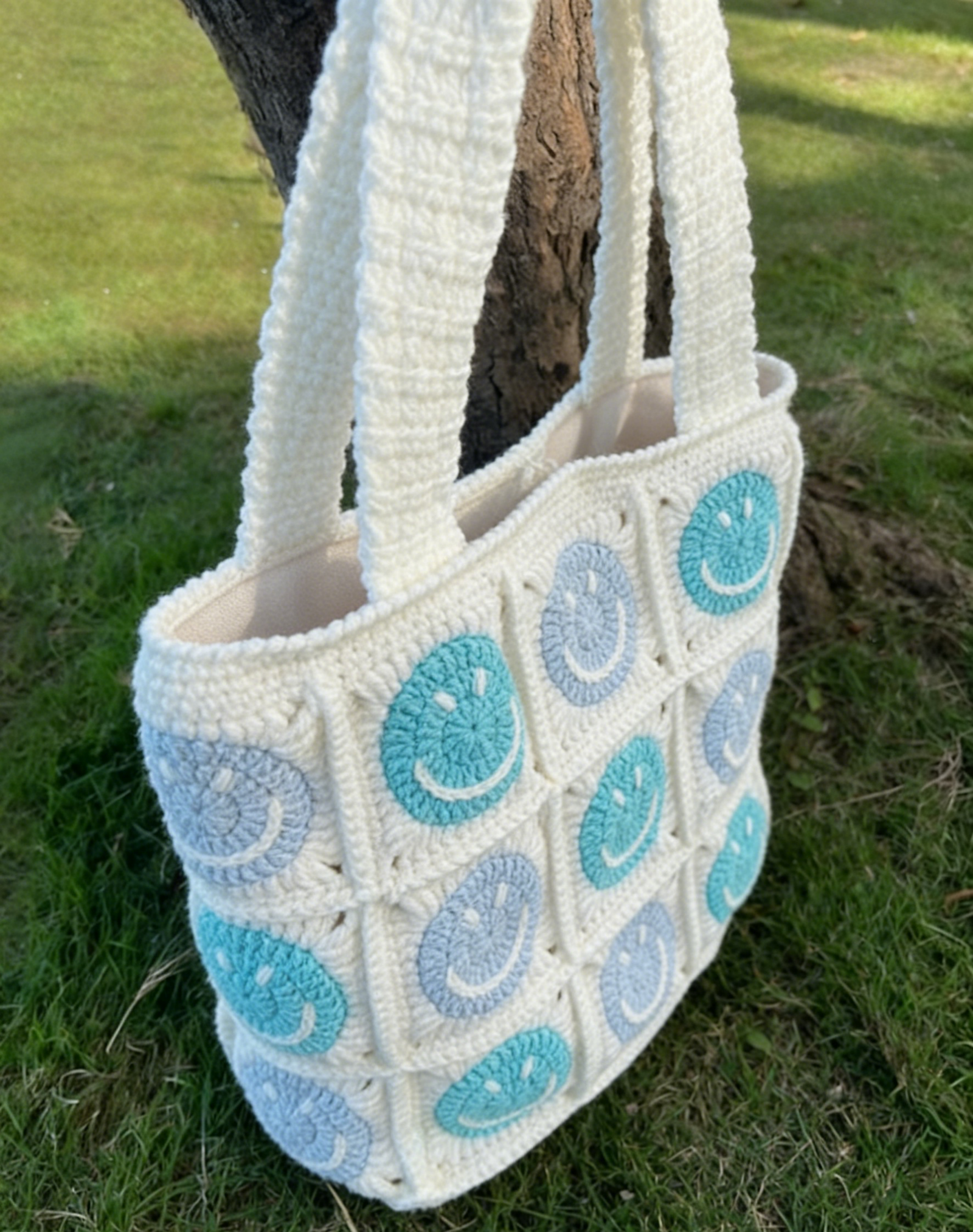 Five strands of cotton yarn are knitted together. A blue smiling face corn-patterned diagonal crossbody bag, a daily schoolbag, a single-shoulder bag, a snack and meal box bag. Unique, suitable for giving as a gift or for personal use. Suitable for daily commuting. Suitable for pairing with any clothes to add your distinctive beauty. Children can put stationery and travel snacks in it. Soft and not prone to color fading.
