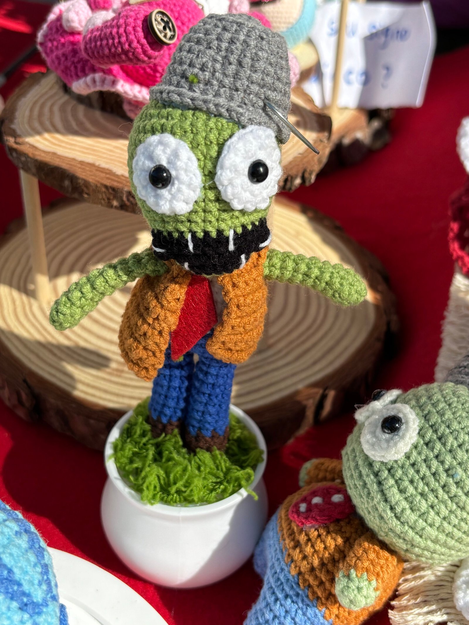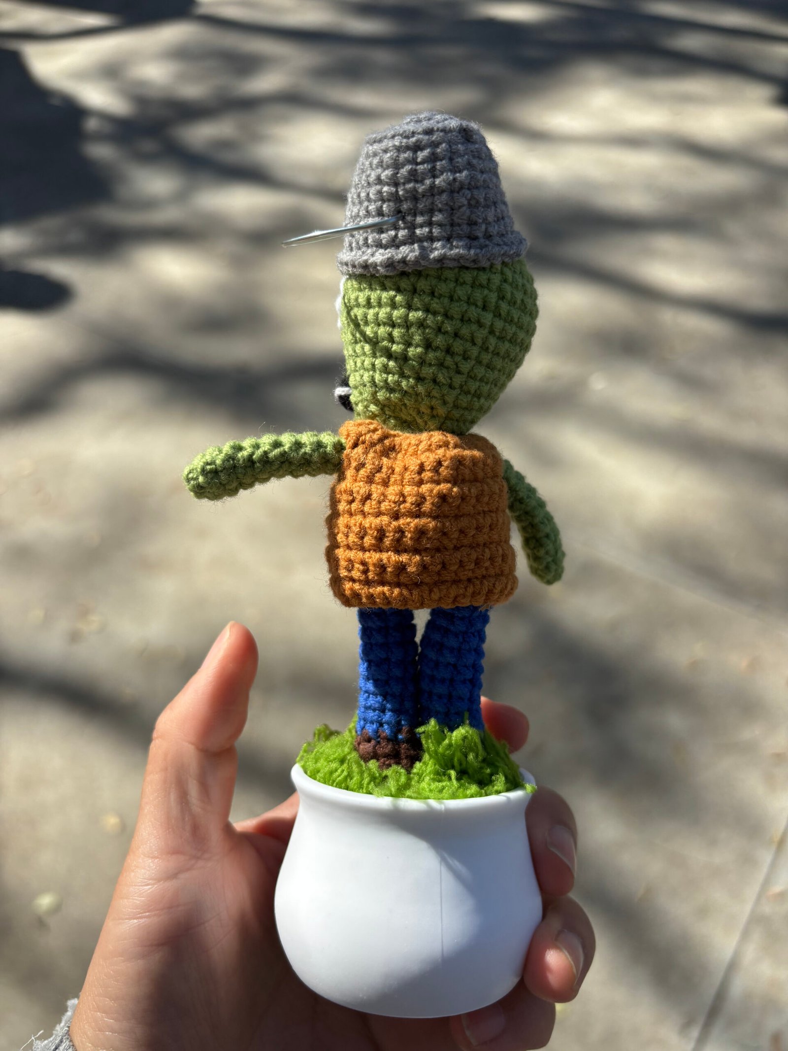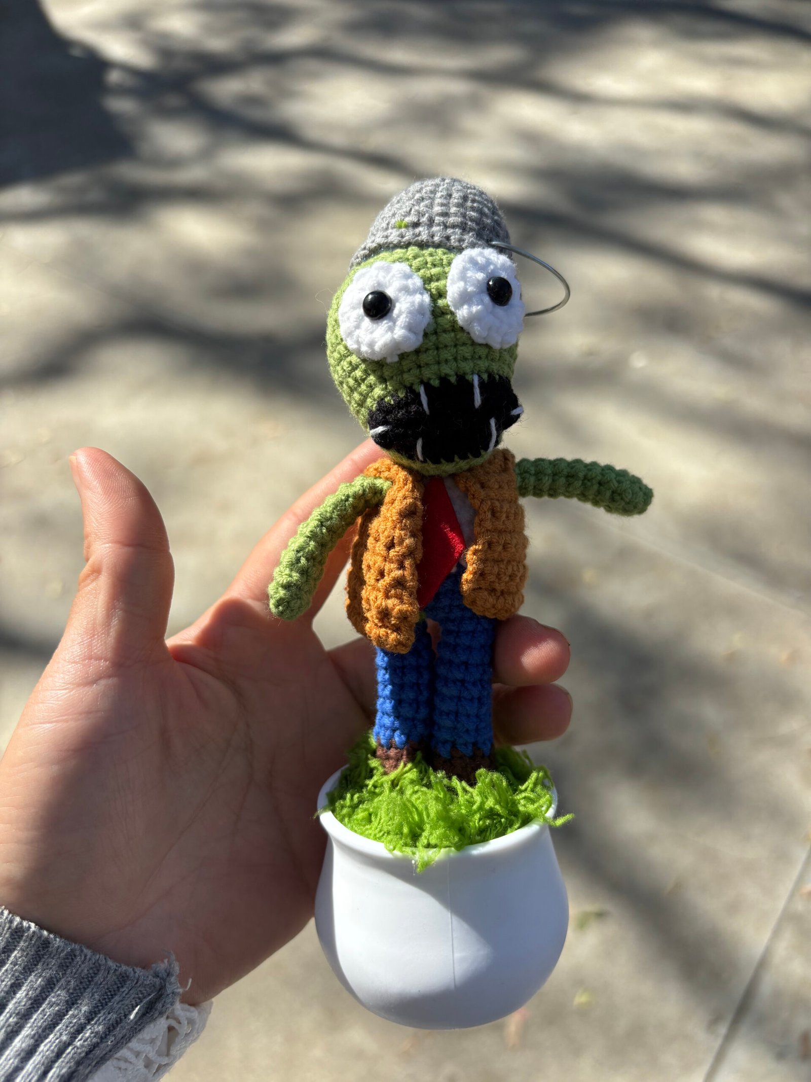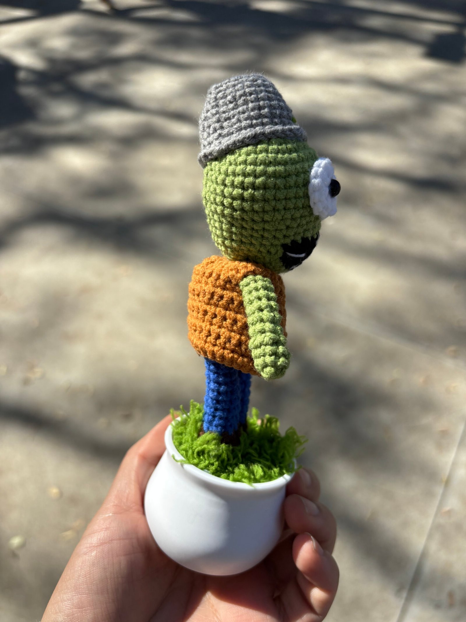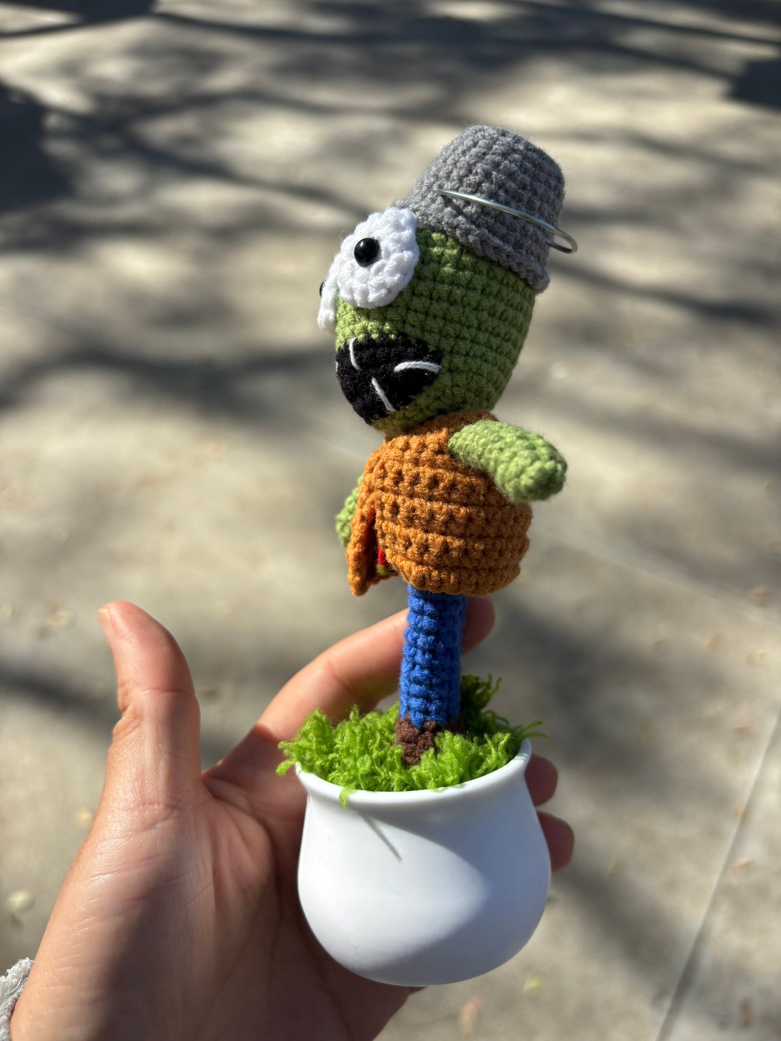 【UNIQUE CROCHET DESK DECOR】Our hand-crochet Plants vs. Zombies Buckethead Zombie potted decor is meticulously crafted by hand, each piece brimming with the artisan’s care and warmth. This nostalgic design features a green zombie head topped with a gray bucket, large white eyes with black safety pupils, a black mouth with stitched white teeth, a brown vest over a red tie, blue pants, and brown shoe details, all nestled in a smooth white pot with green moss accents—creating a one-of-a-kind desk companion that feels like a beloved game character come to life. No two decor pieces are identical, making yours a unique keepsake that stands out in any desk or shelf display. It’s not just a decor; it’s a stress-relief buddy that will bring a smile to your face every time you glance at it, creating lasting moments of calm and joy.