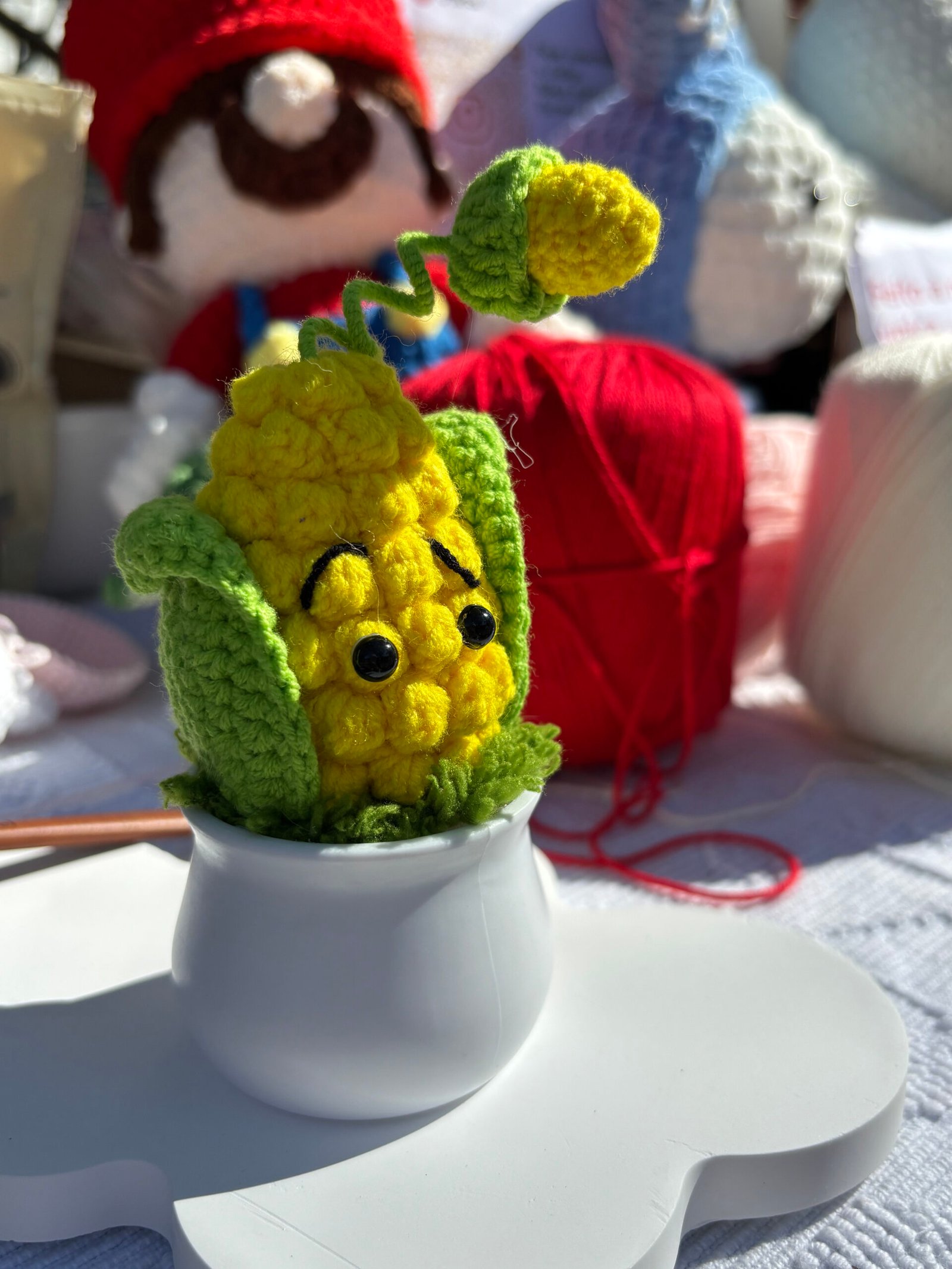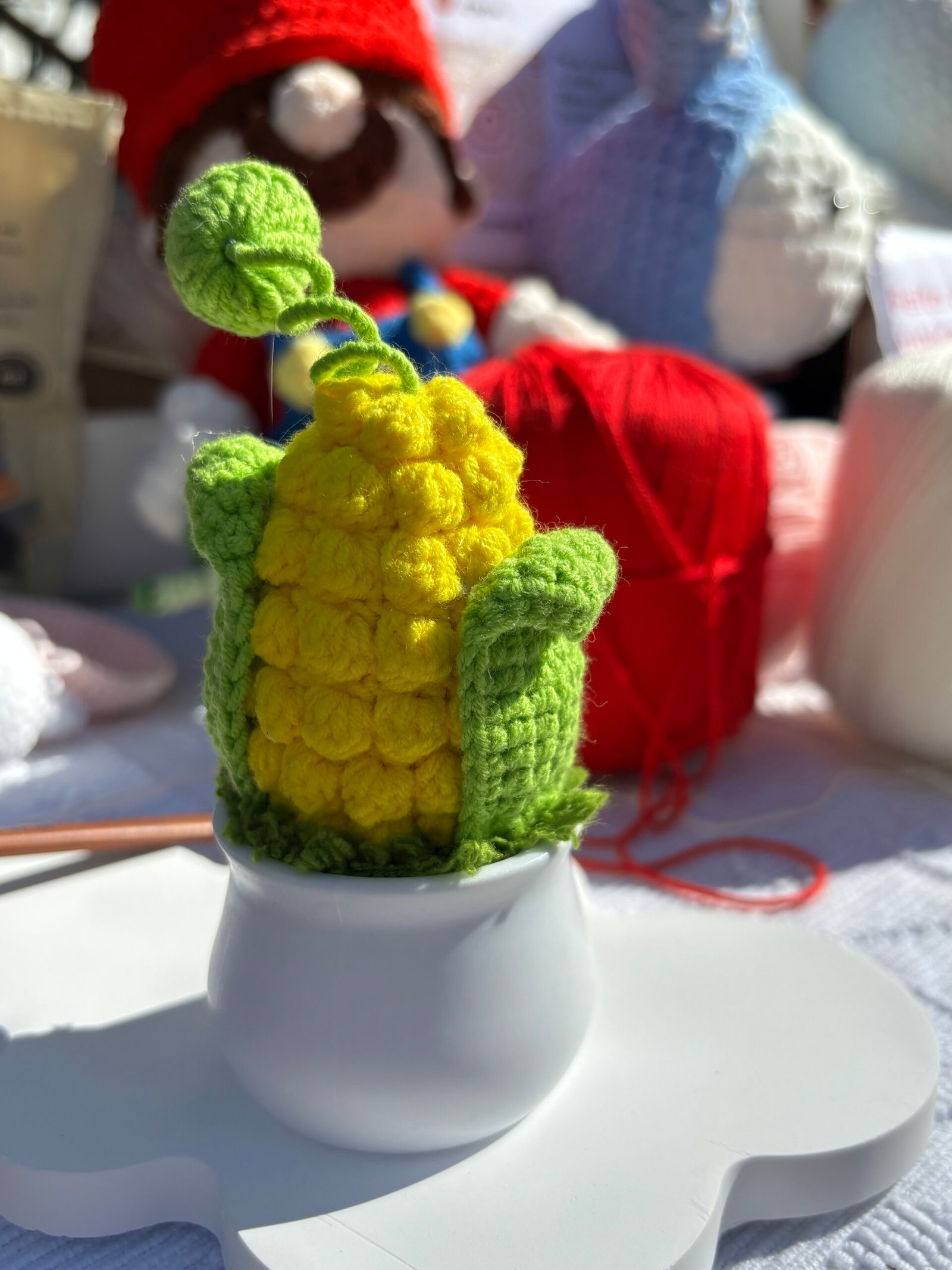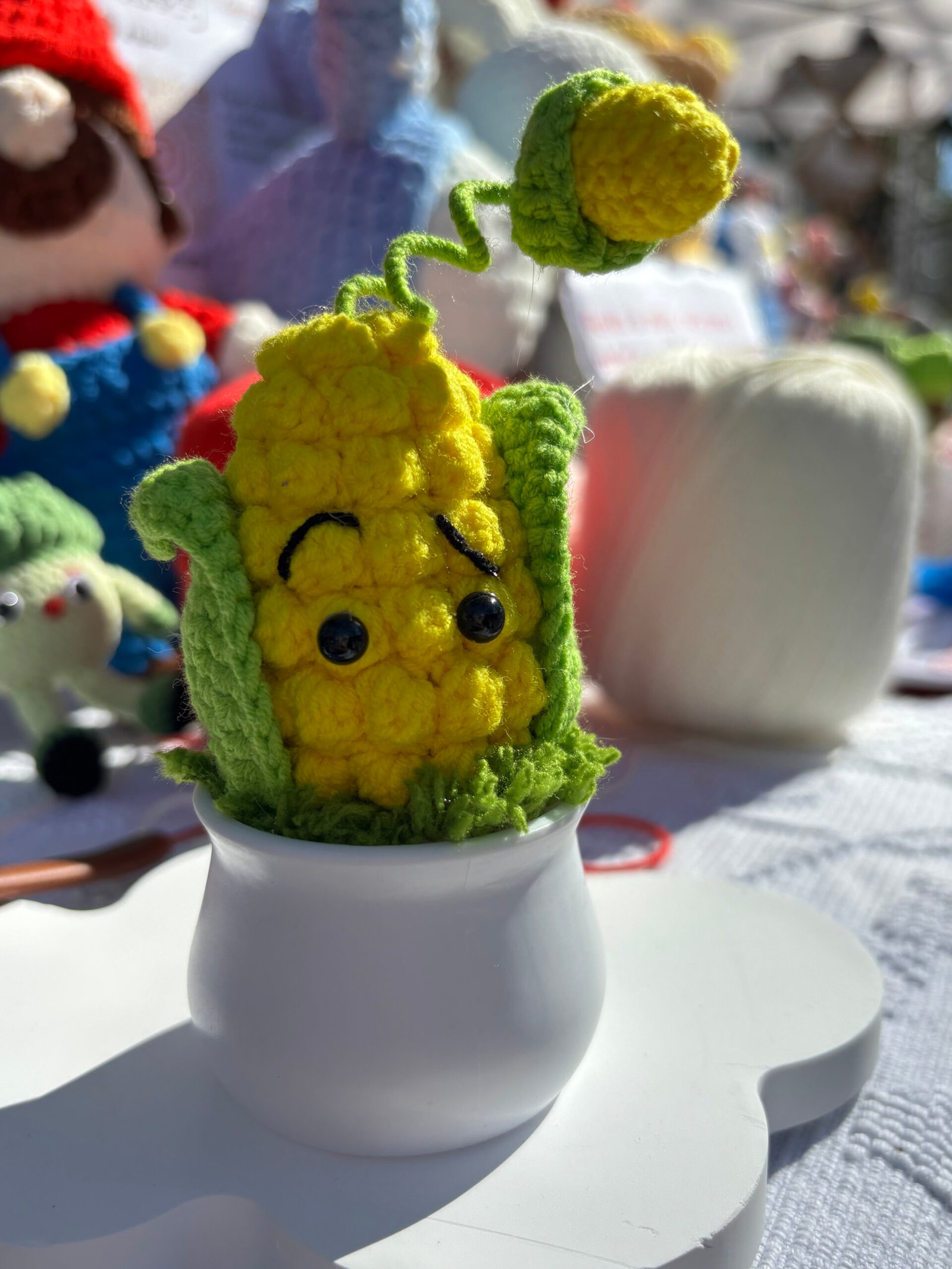 【CARE INSTRUCTIONS】Easy to care for: simply spot clean the crocheted portion with cold water and mild soap, avoiding full submersion. Wipe the plastic pot with a dry cloth to maintain its smooth finish. Gently reshape the corn body, leaves, and kernel after cleaning to maintain its cute silhouette.