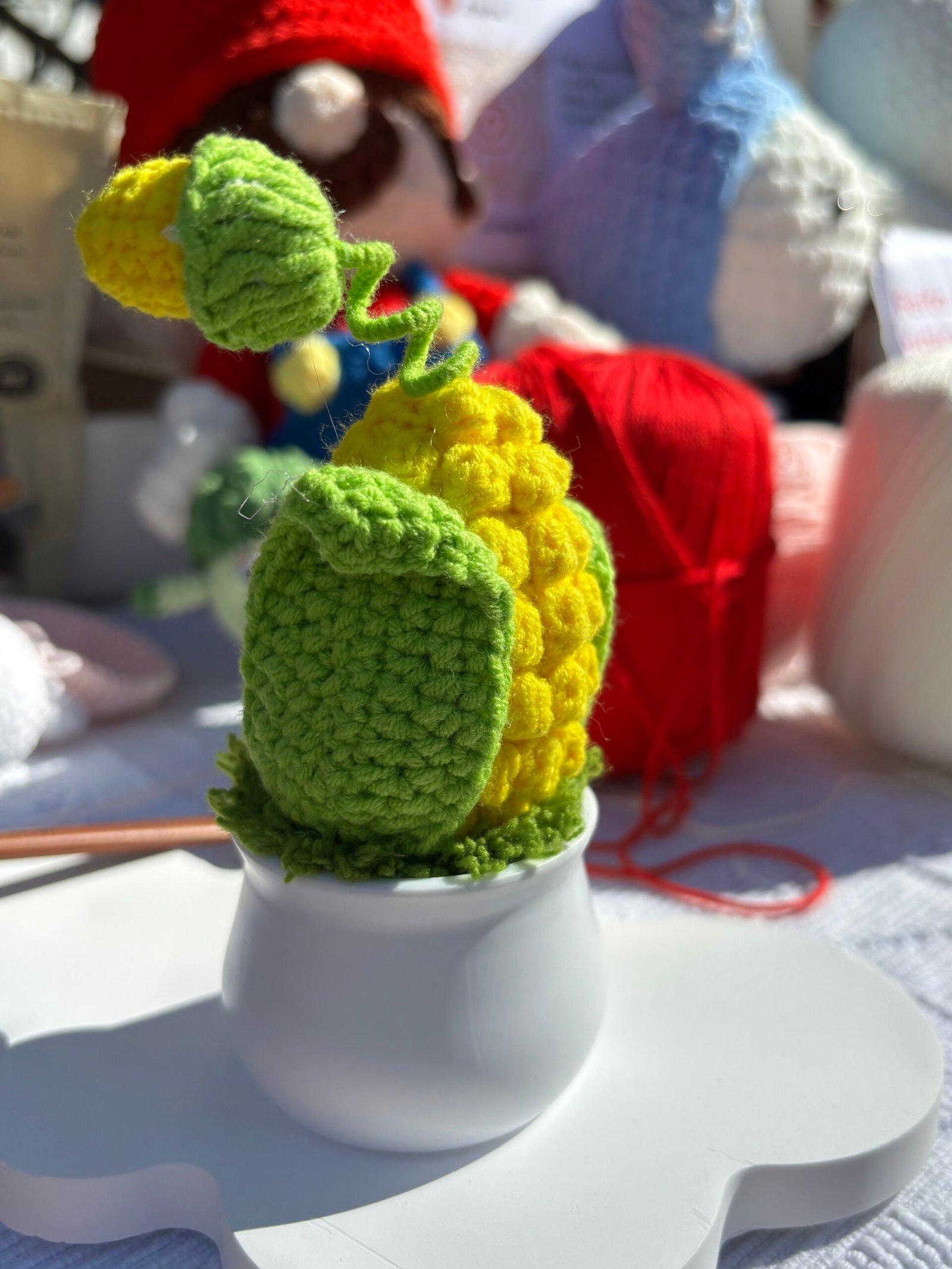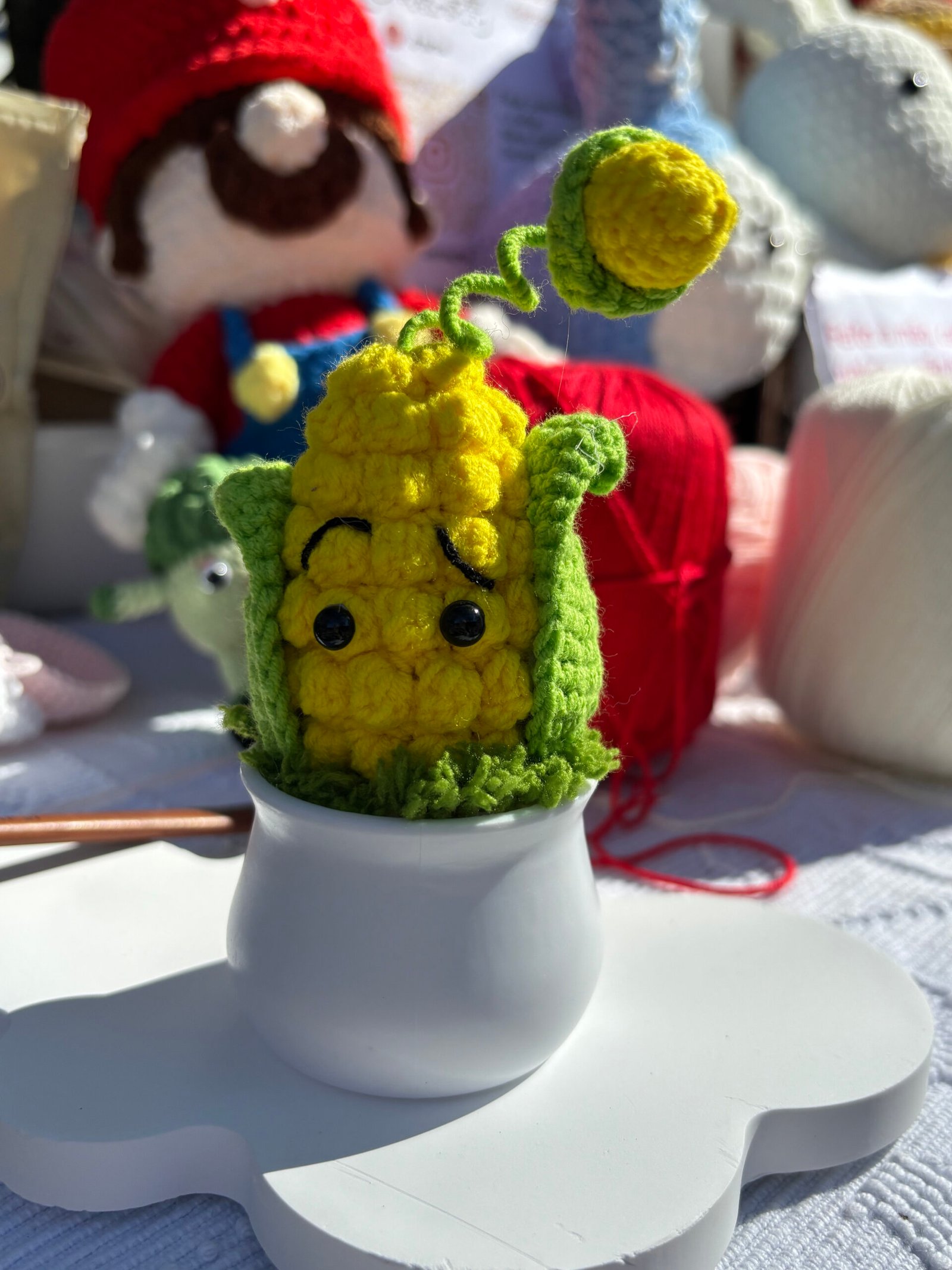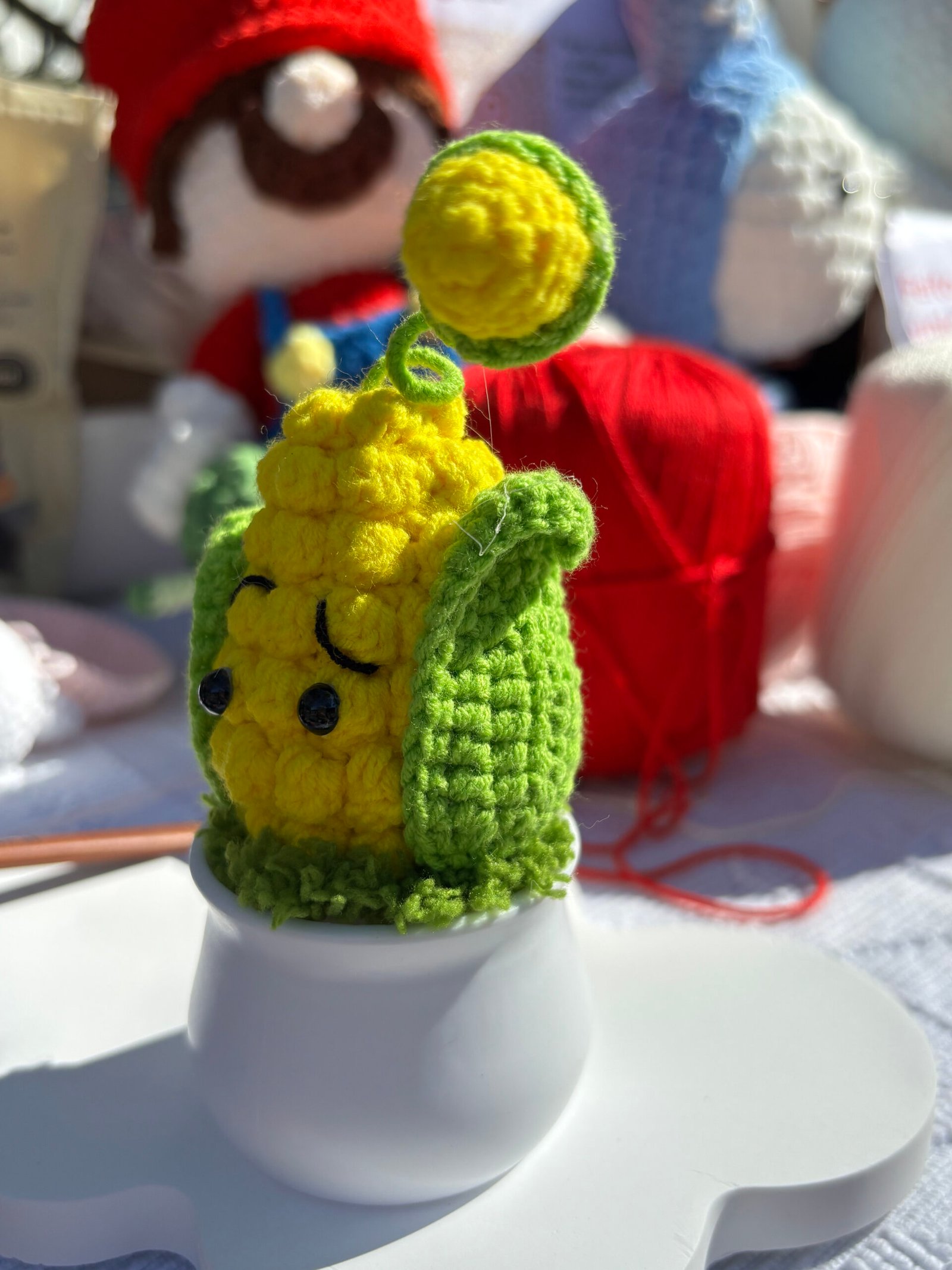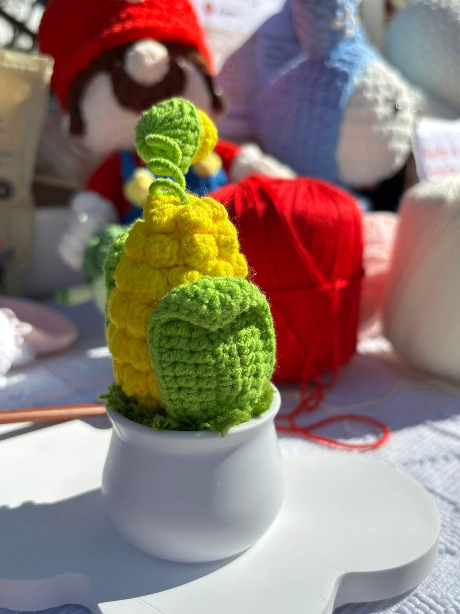 【CARE INSTRUCTIONS】Easy to care for: simply spot clean the crocheted portion with cold water and mild soap, avoiding full submersion. Wipe the plastic pot with a dry cloth to maintain its smooth finish. Gently reshape the corn body, leaves, and kernel after cleaning to maintain its cute silhouette.