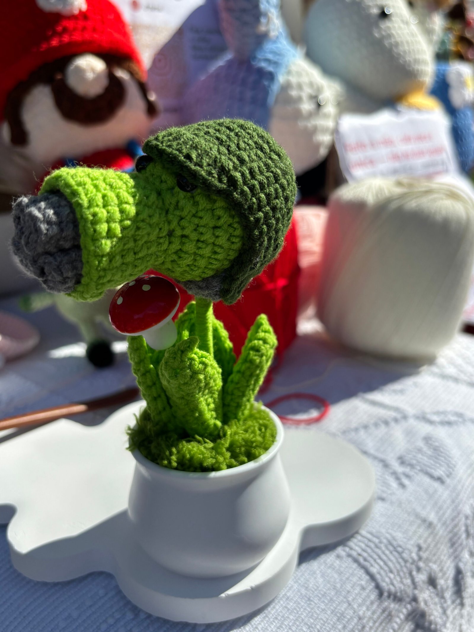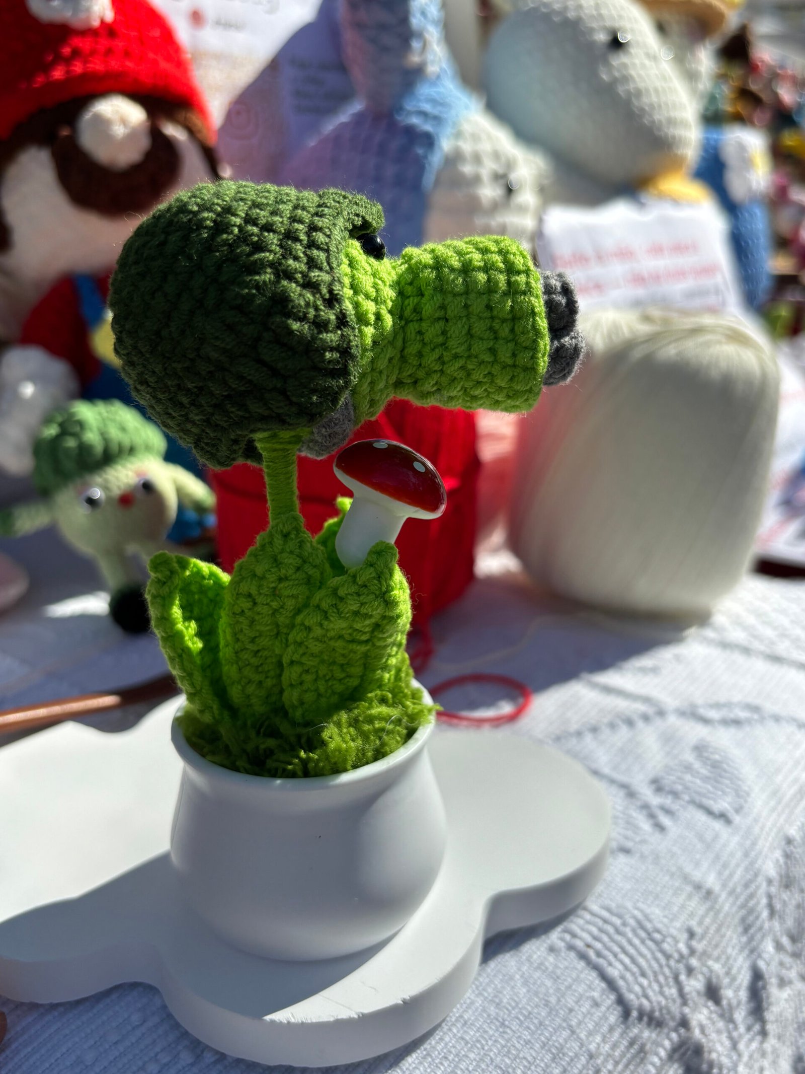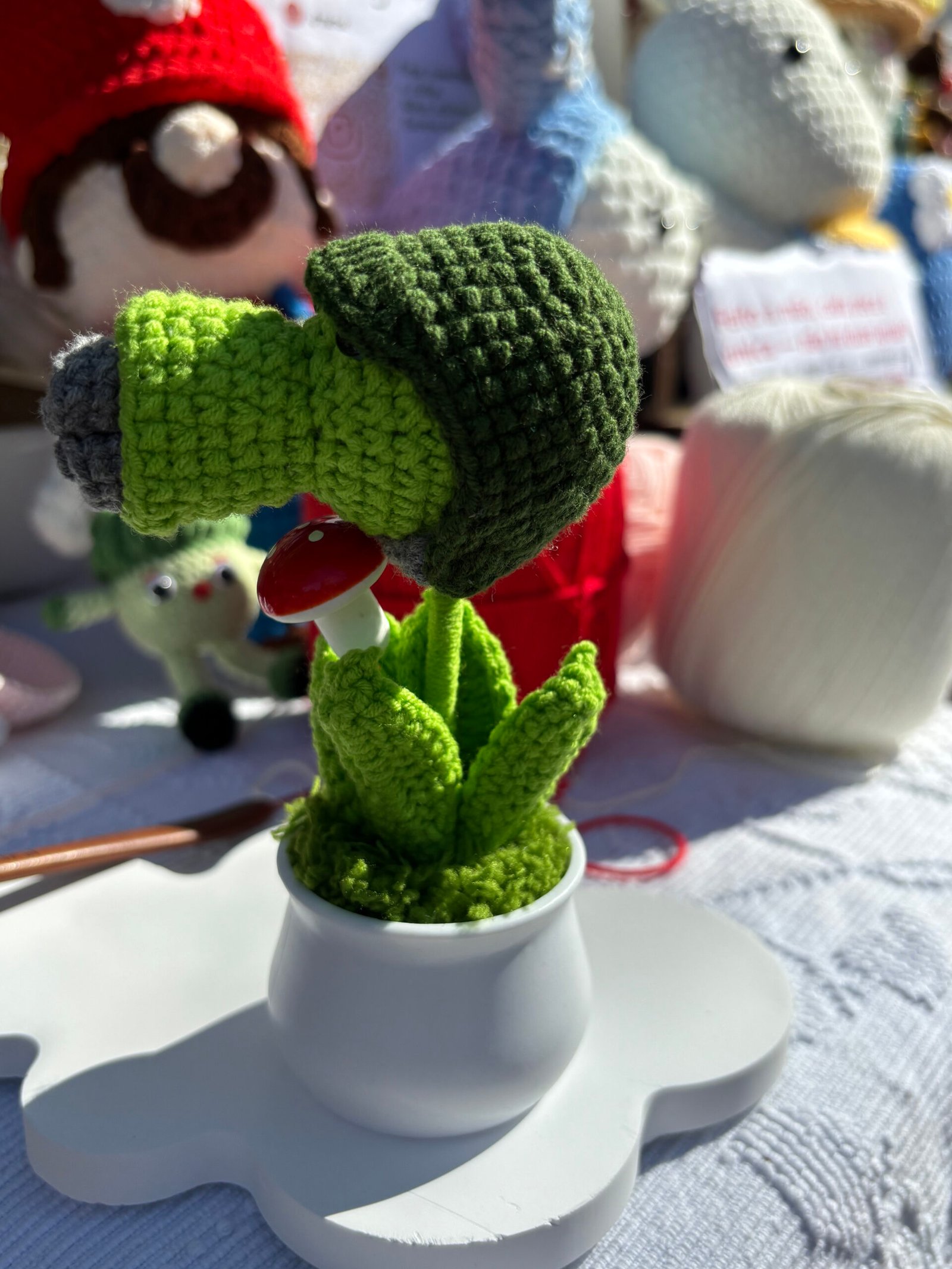 【CARE INSTRUCTIONS】Easy to care for: simply spot clean the crocheted portion with cold water and mild soap, avoiding full submersion. Wipe the plastic pot with a dry cloth to maintain its smooth finish. Gently reshape the cannon body, leaves, and mushroom after cleaning to maintain its cute silhouette.