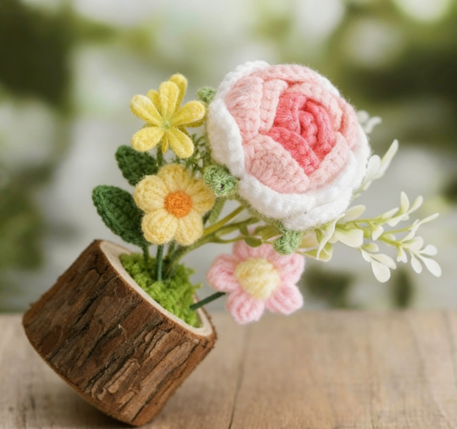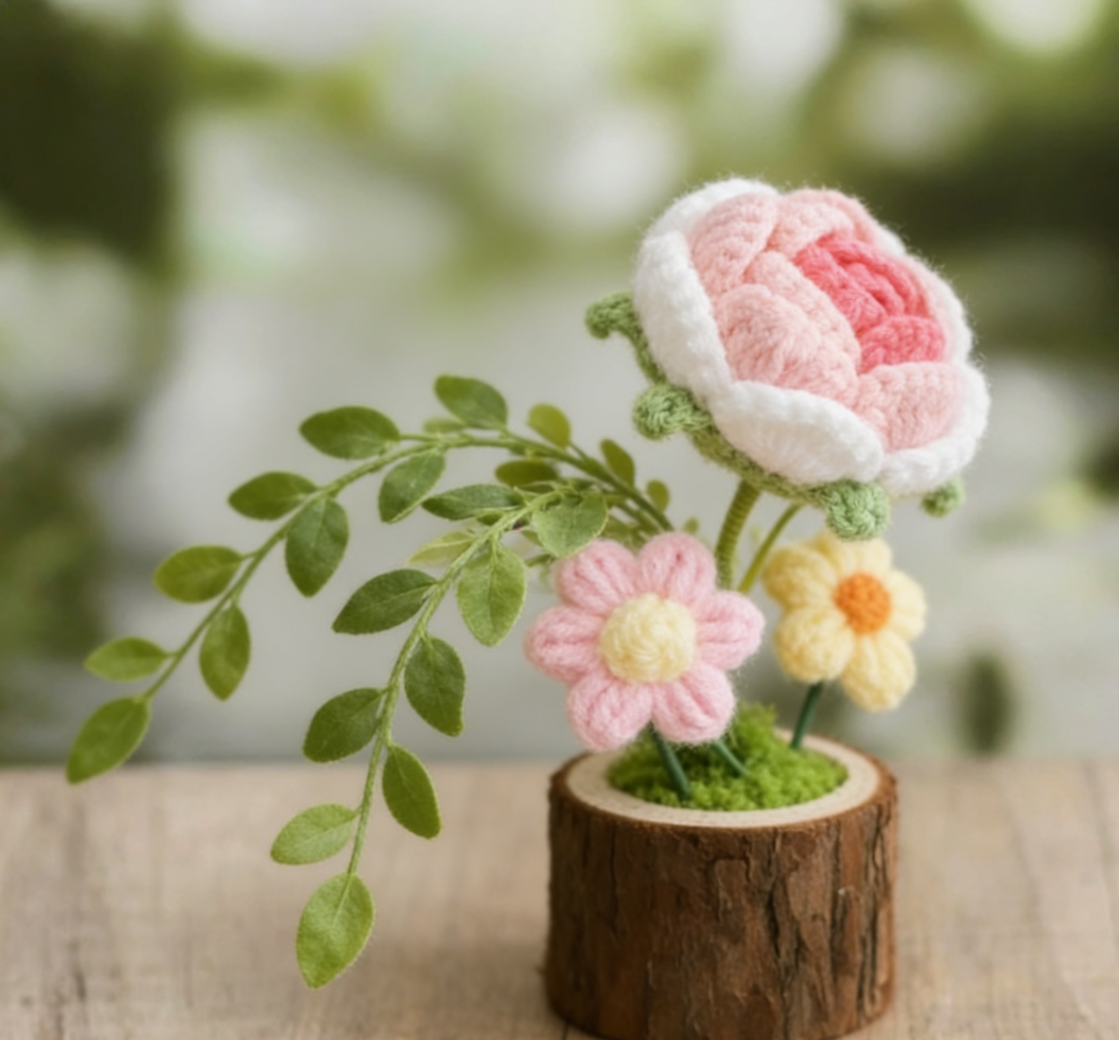 Hand-Knitted Gradient Pink Rose Flower Arrangement; Unique Design; Soft Cotton Crochet Potted Plant; Mini Tabletop Decor; Daily Home & Office Use; Ideal Gift for Birthday & Mother’s Day; Durable & Maintenance-Free; Artificial Floral Decor; Spritz with Perfume for Natural Scent Diffusion, Releases Your Unique Fragrance
