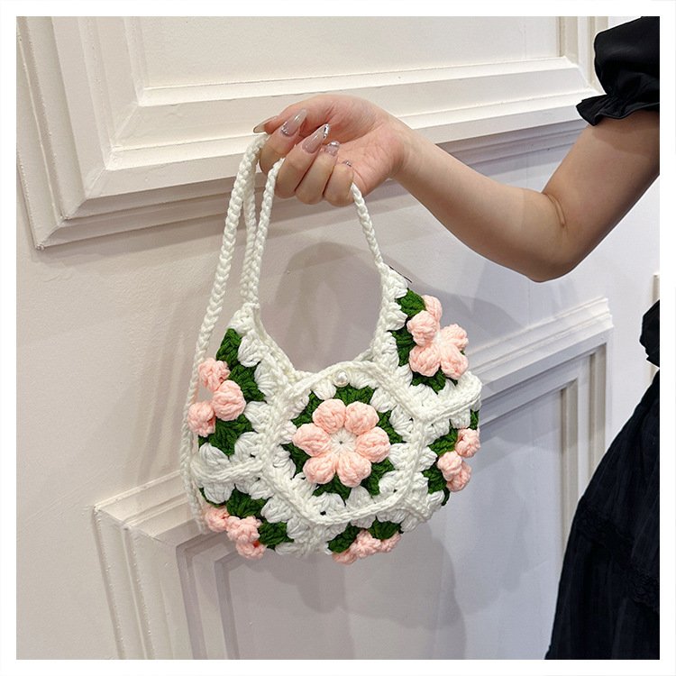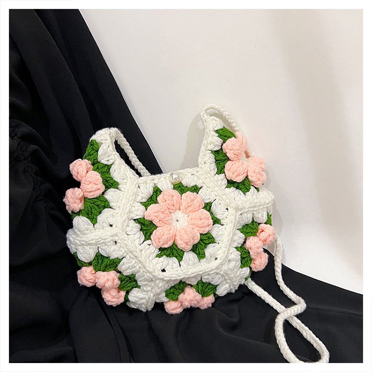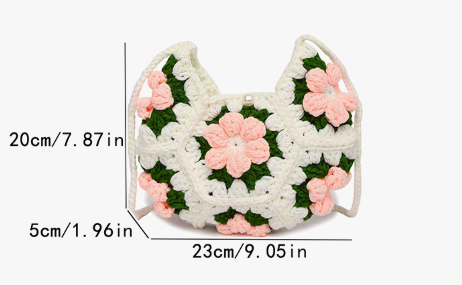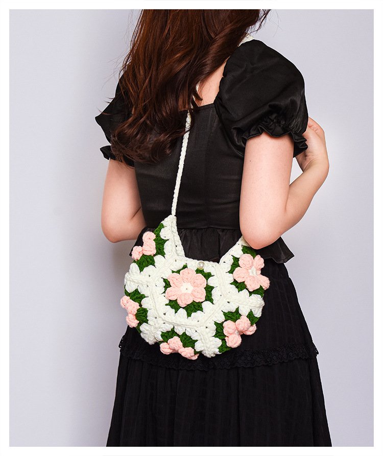 【UNIQUE】Our hand-knitted floral crescent bags are meticulously crafted by hand, each piece brimming with the artisan’s care and warmth. This romantic design features delicate 3D pink roses and daisies set against a lush green and white crochet base, creating a whimsical garden aesthetic that’s truly one-of-a-kind. No two bags are identical, making yours a unique expression of your gentle style. It’s not just a bag; it’s a wearable piece of art that adds a soft, feminine touch to your daily look. As a gift, it conveys sweetness and thoughtfulness, making the recipient feel instantly cherished.